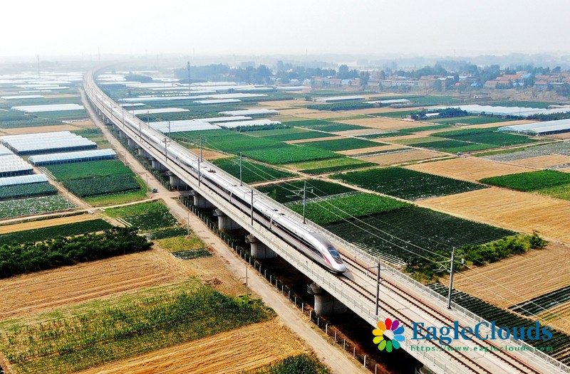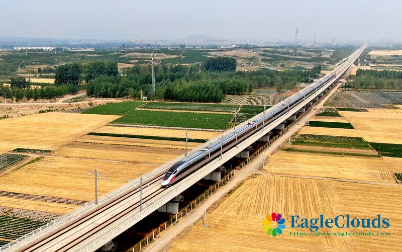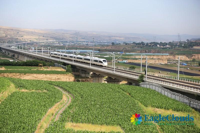6月14日,一列高铁列车行驶在宝兰高铁甘肃定西境内。