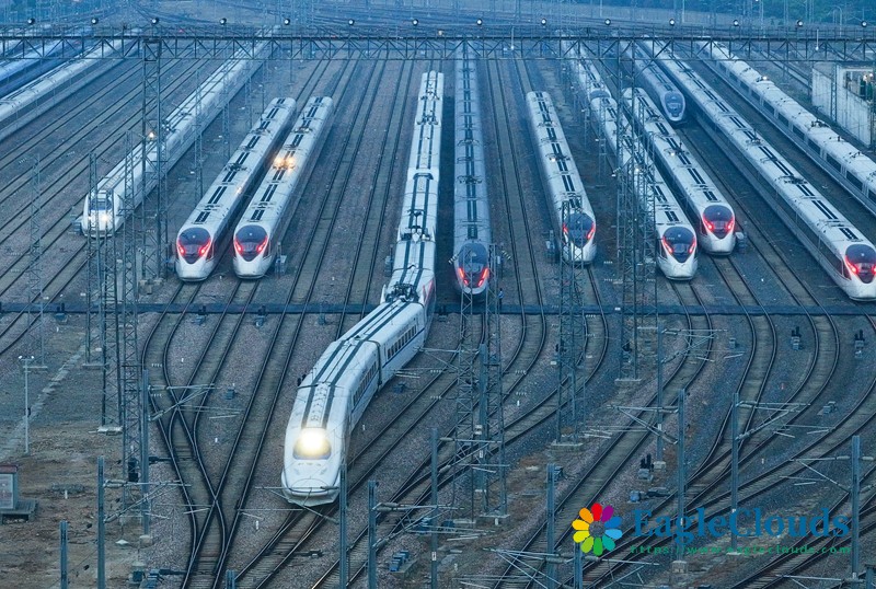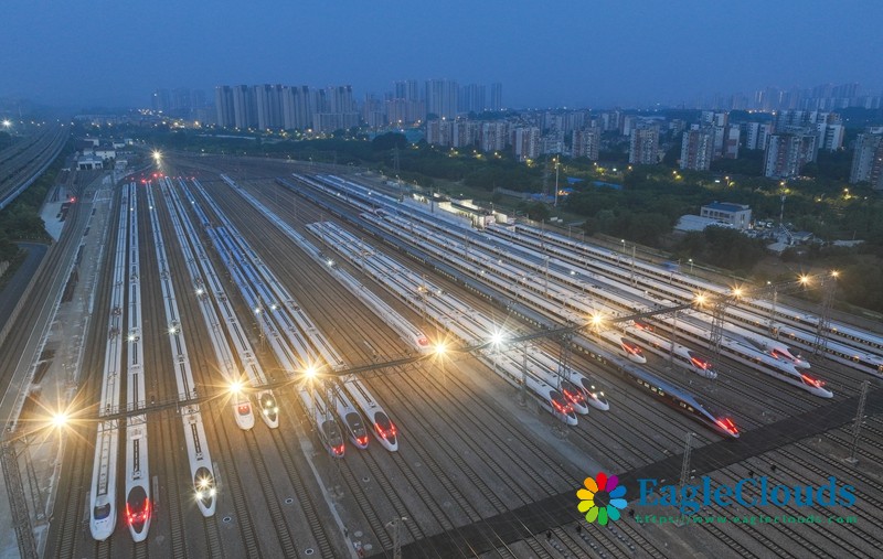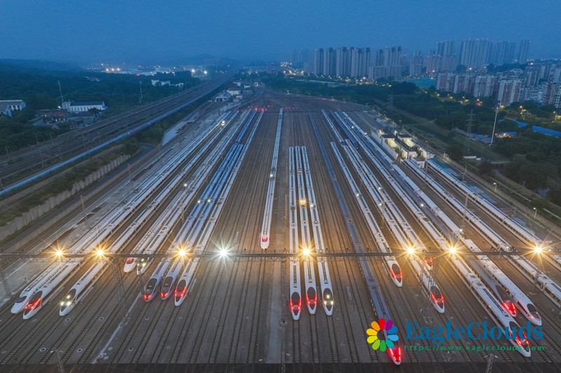 6月14日,动车停靠在南京动车段南京南动车运用所(无人机照片)。
