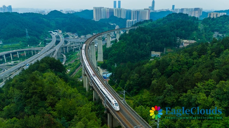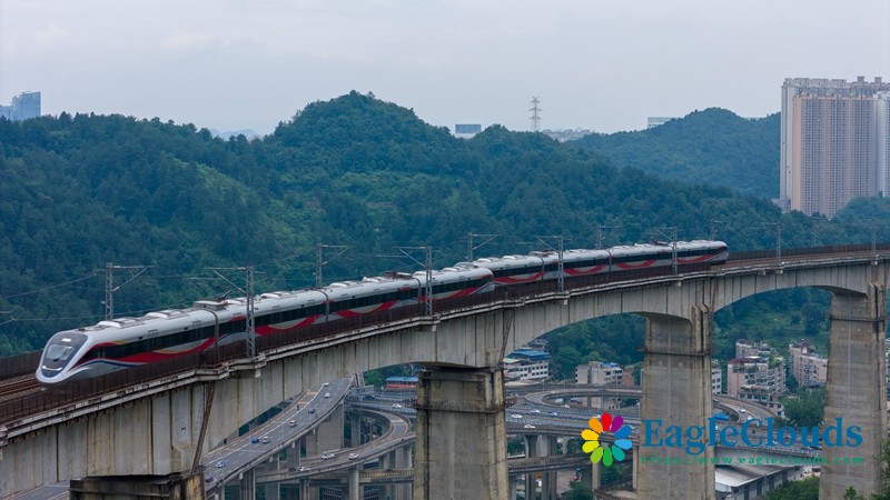 6月14日,动车组列车在贵州省贵阳市境内行驶(无人机照片)。
