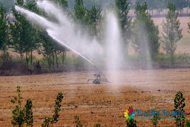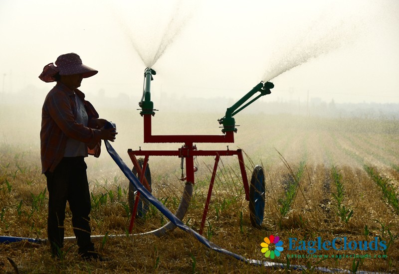 6月23日,山东省枣庄市山亭区城头镇荒沟村农民利用喷灌机为玉米苗浇水。