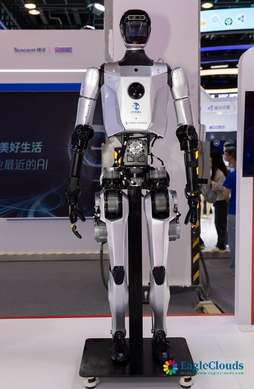 7月4日在2024世界人工智能大会拍摄的全尺寸通用人形机器人开源公版机“青龙”。