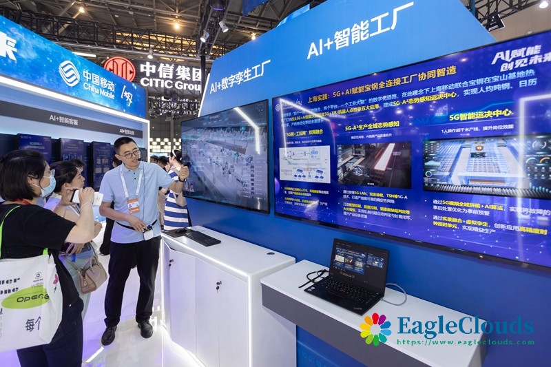 7月4日,人们在中国移动展位了解AI赋能智慧工厂。