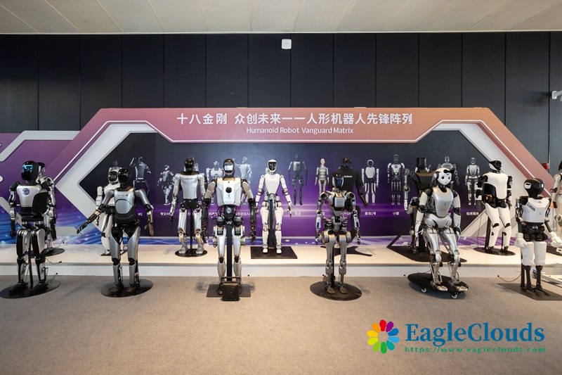 7月4日在2024世界人工智能大会拍摄的“十八金刚 众创未来——人形机器人先锋阵列”。