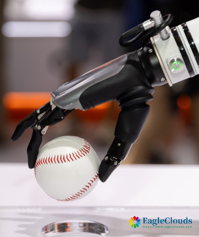 7月4日在2024世界人工智能大会傲意科技展位拍摄的机器人灵巧手。