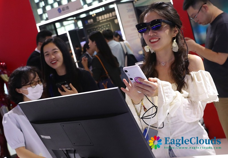 7月4日,参观者在展台上体验一款AR眼镜。