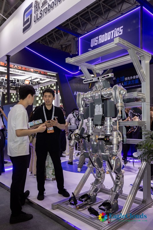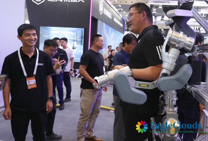 7月4日,参观者(右)在展会现场体验一款重型外骨骼设备。