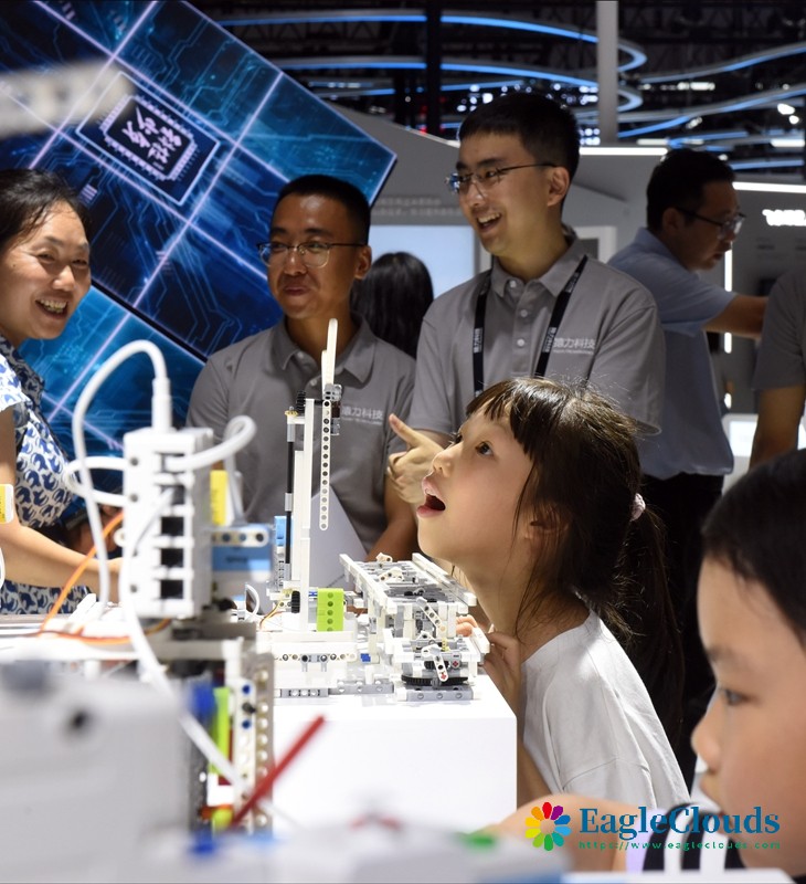 7月4日,在猿力科技展台,两名女孩在体验“编程智能硬件”。