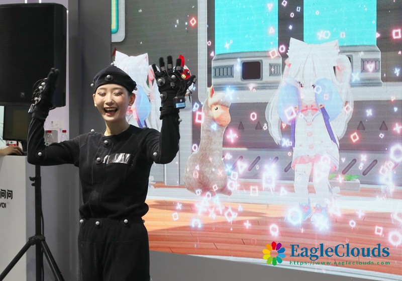 7月4日,一名工作人员在展台上进行3D动作捕捉技术的演示。