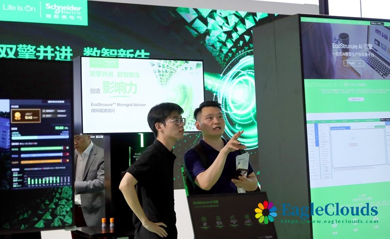 7月4日,参观者在一组AI模型平台演示屏幕前交流讨论。