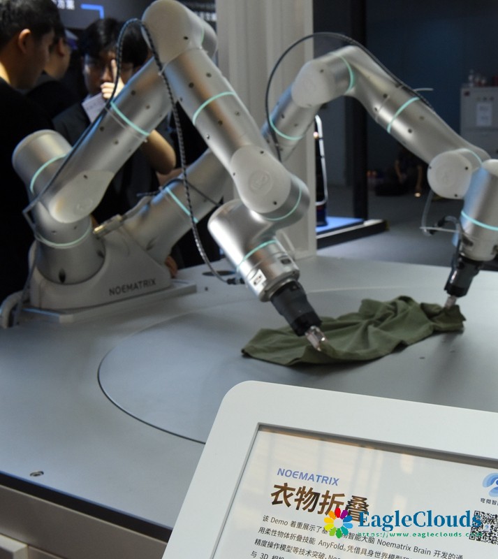7月4日在展会上拍摄的智能衣物折叠机器人。