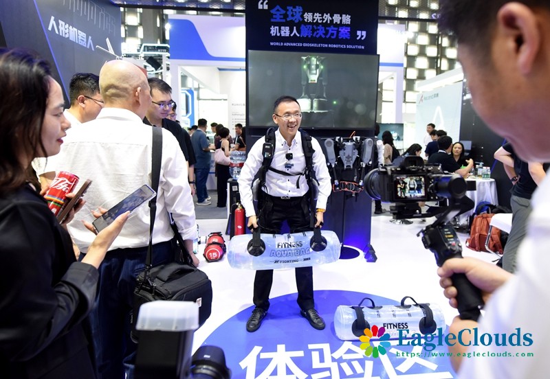 7月4日,一名参观者穿上“智能外骨骼”轻松举起数十公斤的水袋。
