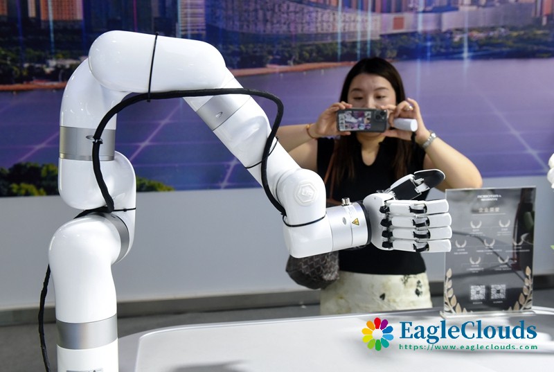 7月4日,一名观众在拍摄“灵巧机械手”。