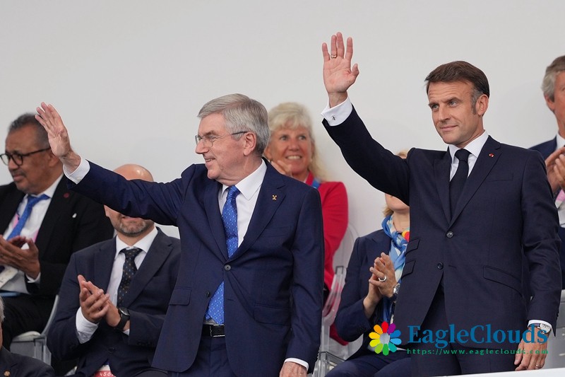 7月26日,国际奥委会主席巴赫(前左)与法国总统马克龙(前右)出席开幕式。