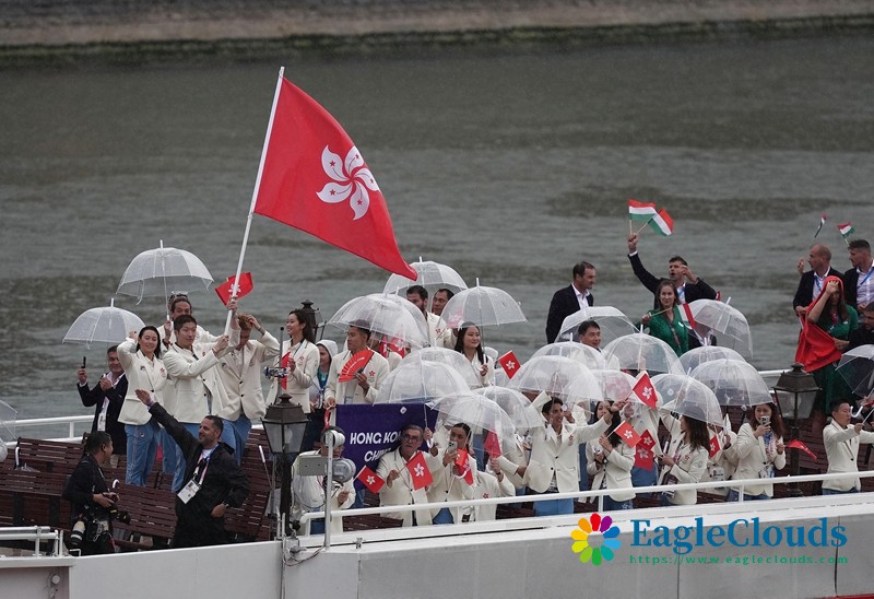 7月26日,中国香港和匈牙利体育代表团成员在开幕式上。