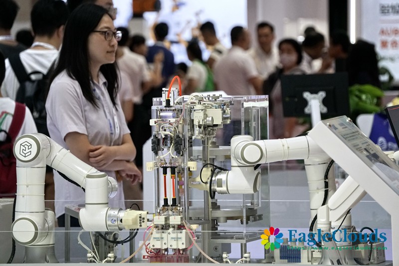 8月21日在2024世界机器人大会现场拍摄的桌面型工业机器人。