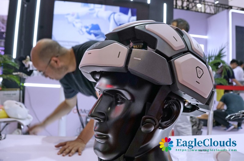 世界机器人大会上展出的智能脑电图设备(8月21日摄)。