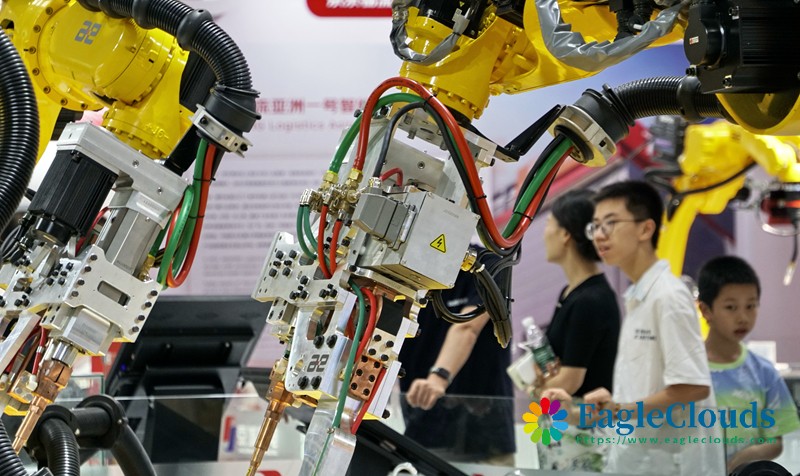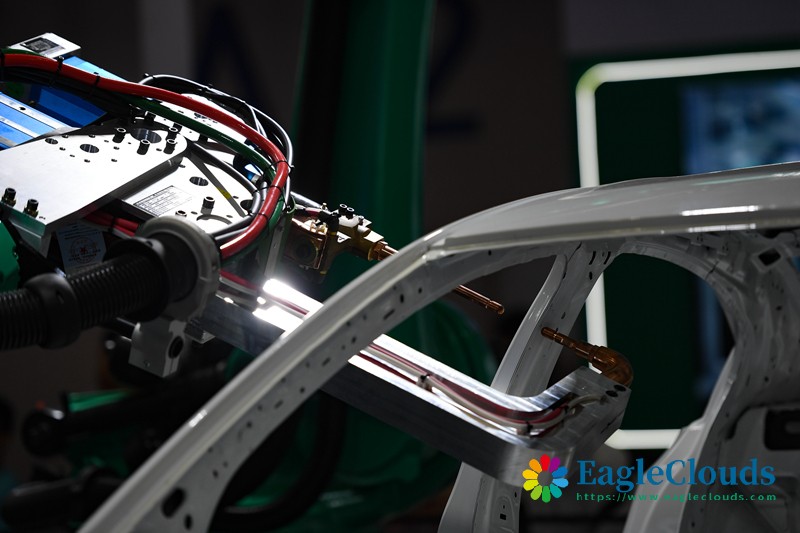 8月21日,在2024世界机器人大会艾创科技展台,机器人演示汽车车架点焊操作。