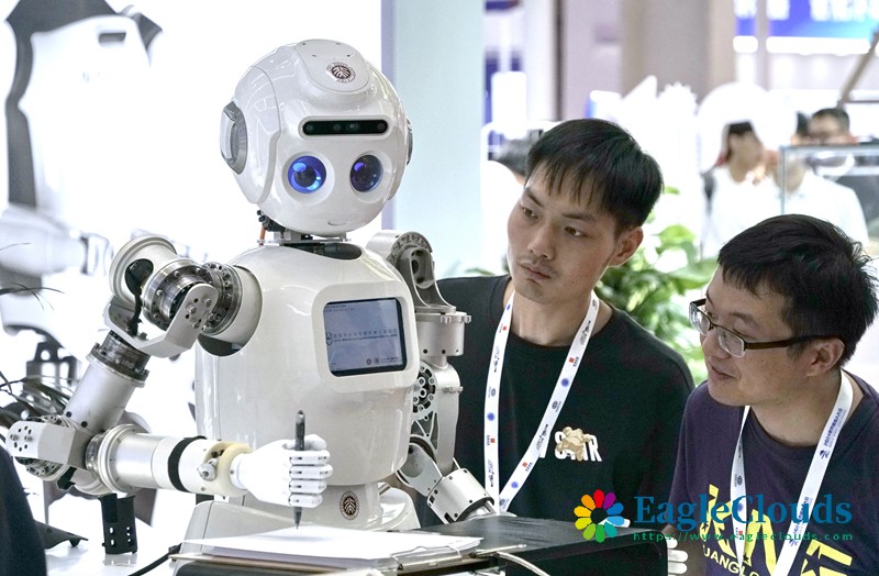 8月21日,观众在世界机器人大会上参观教育类机器人。