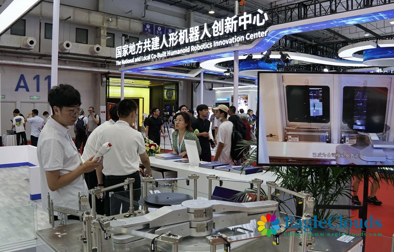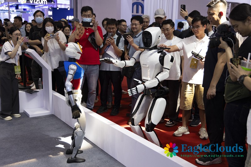 8月21日,在2024世界机器人大会现场,两款人形机器人在互相“问候”。