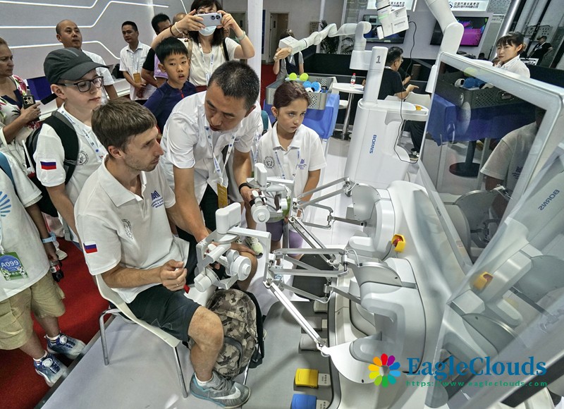 8月21日,观众在世界机器人大会参观医疗机器人。