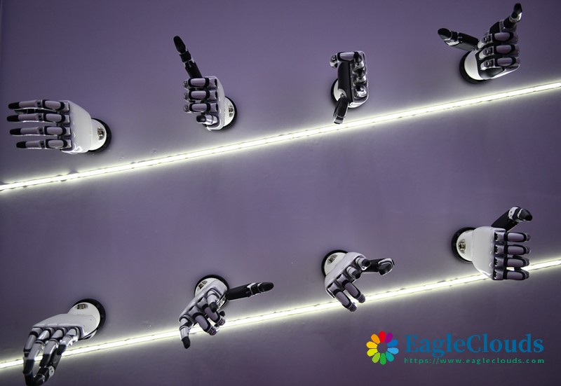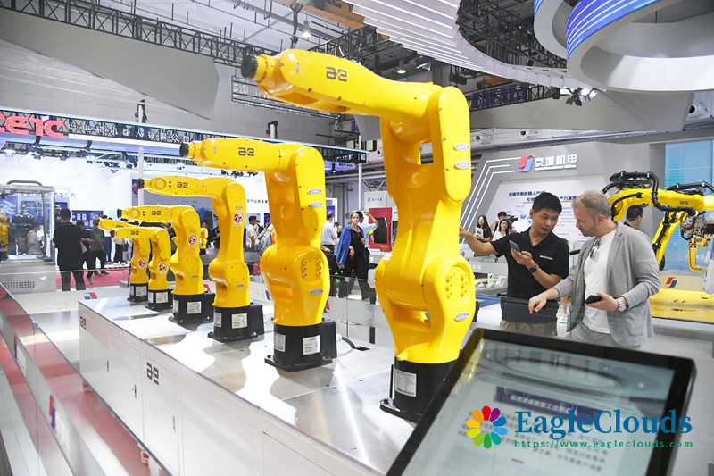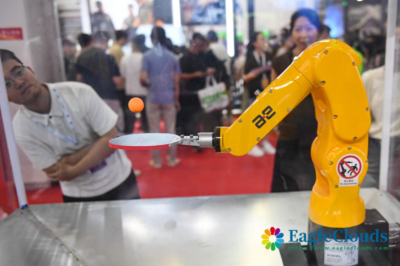世界机器人大会上展示的智能机械手(8月21日摄)。