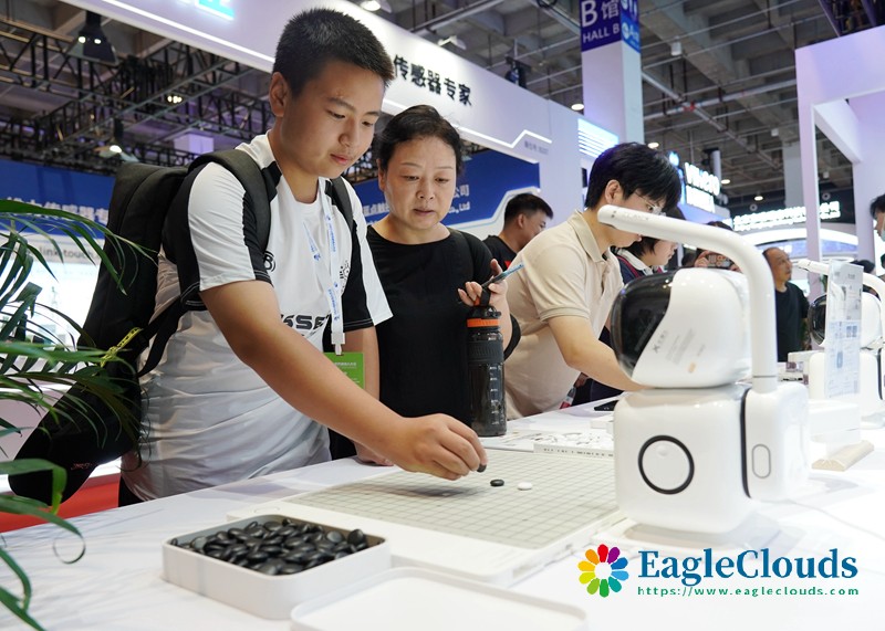 8月21日,观众在2024世界机器人大会上与机器人下棋。