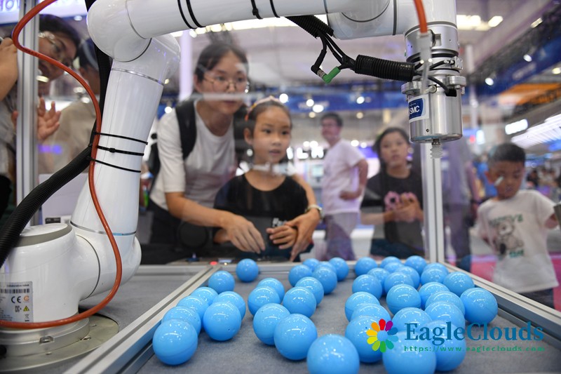 8月21日,观众在2024世界机器人大会现场体验一款可以吸取扭蛋的机器人。