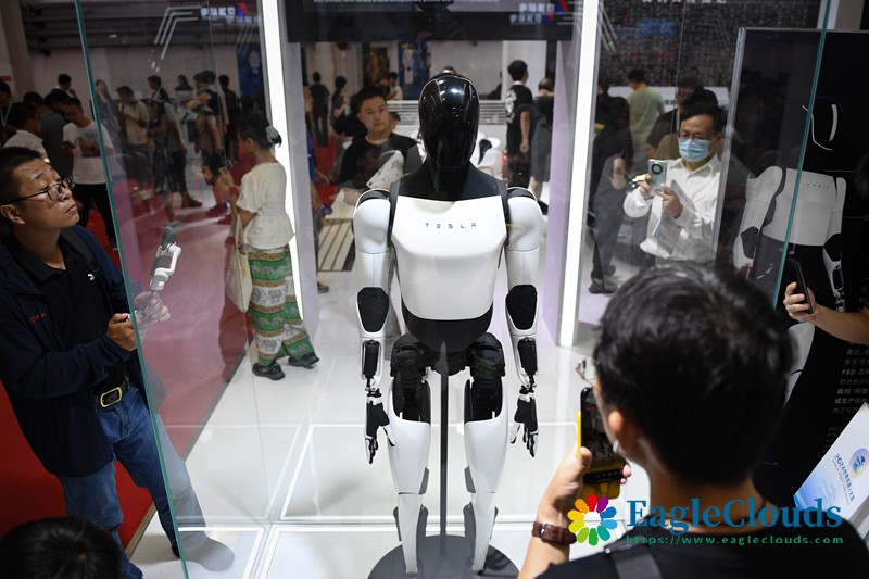 这是8月21日拍摄的2024世界机器人大会特斯拉展台上的人形机器人。