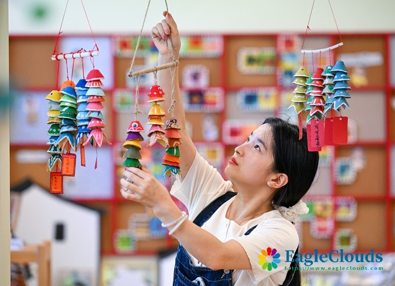 8月30日,浙江省宁波市镇海区宝山幼儿园的老师在教室整理教具。