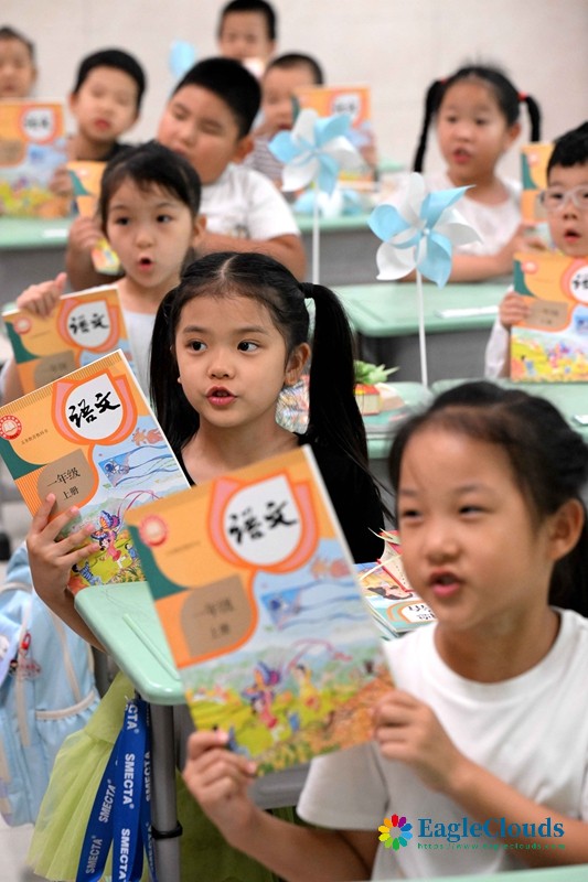 8月30日,在河北省石家庄市柏林庄学校,新一年级小朋友展示自己的新教材。
