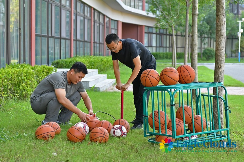8月30日,山东省烟台市福山区芝阳山学校的老师在为篮球、足球充气。