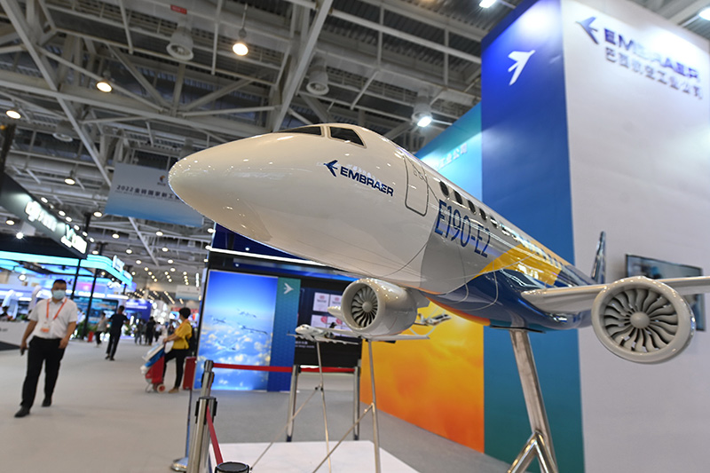 9月8日拍摄的在第二十二届投洽会巴西航空工业公司展位展出的E190-E2飞机模型。
