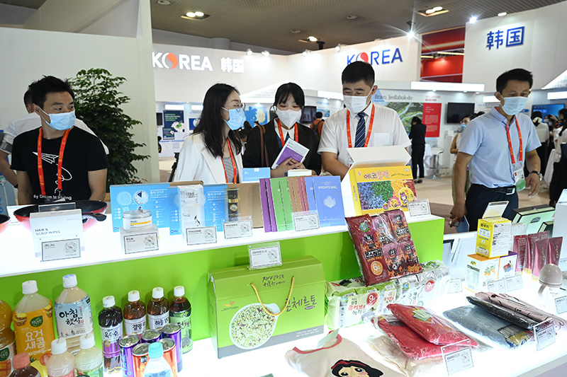 9月8日,参观者在第二十二届投洽会主宾国韩国的展位参观选购产品。