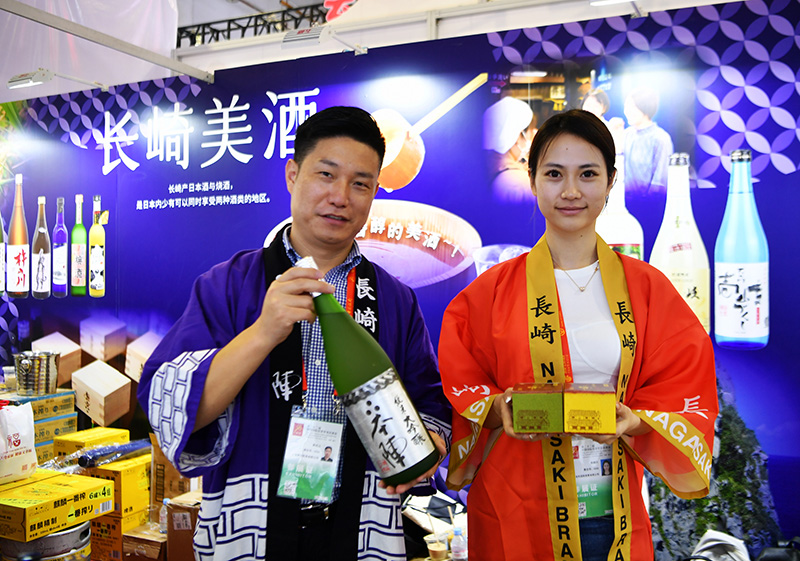 9月8日,在第二十二届投洽会日本长崎展位,工作人员在展示清酒和蛋糕。
