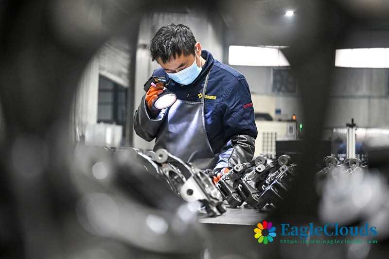 12月10日,在位于河南省商丘市夏邑县会亭镇的河南淮海精诚工业科技有限公司,工人在检测汽车配件。