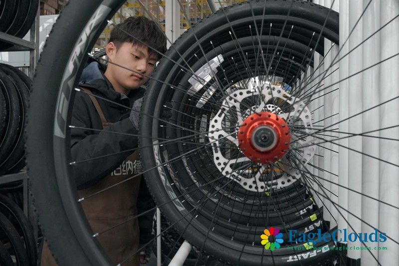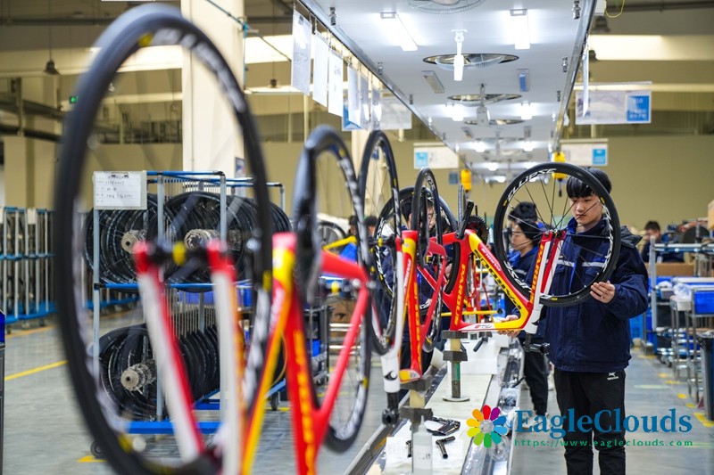12月12日,山东省乐陵市经济开发区一体育用品生产企业,工人在碳纤维自行车生产线上赶制一批出口海外的订单。