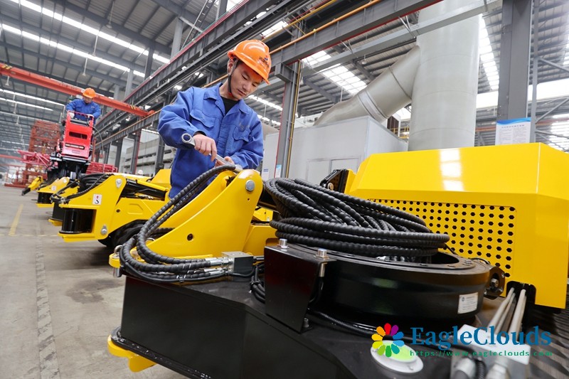 12月12日,在位于浙江省湖州市德清县雷甸镇的浙江省建设工程机械集团有限公司德清精益智能工厂,工人在赶制履带式轻型组塔装置产品。