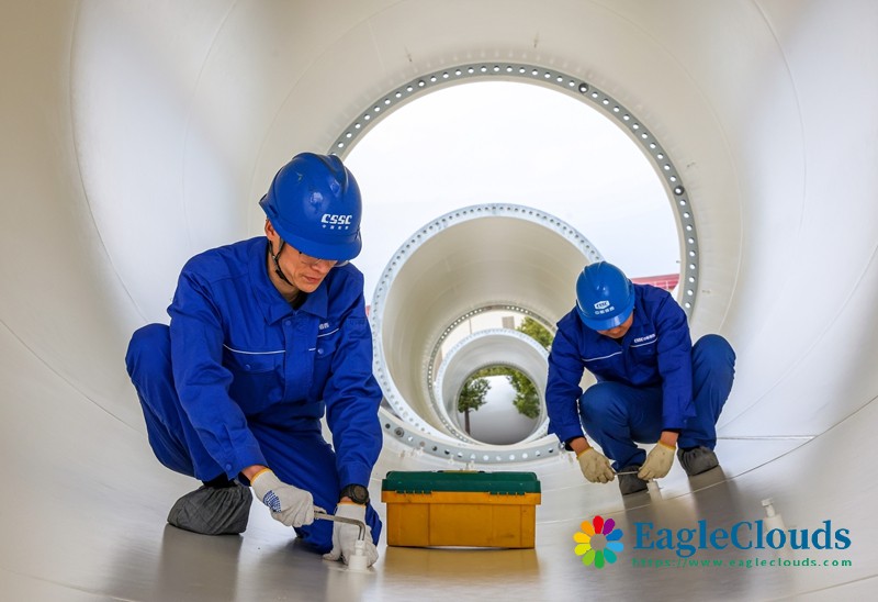 12月12日,在江苏省扬州市江都区中船澄西扬州船舶有限公司,工人在风力发电机塔筒内工作。