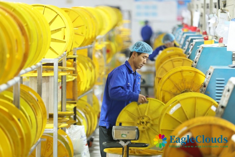 12月12日,工人在江苏省兴化市戴南镇的江苏银锡高温线缆有限公司生产车间作业。
