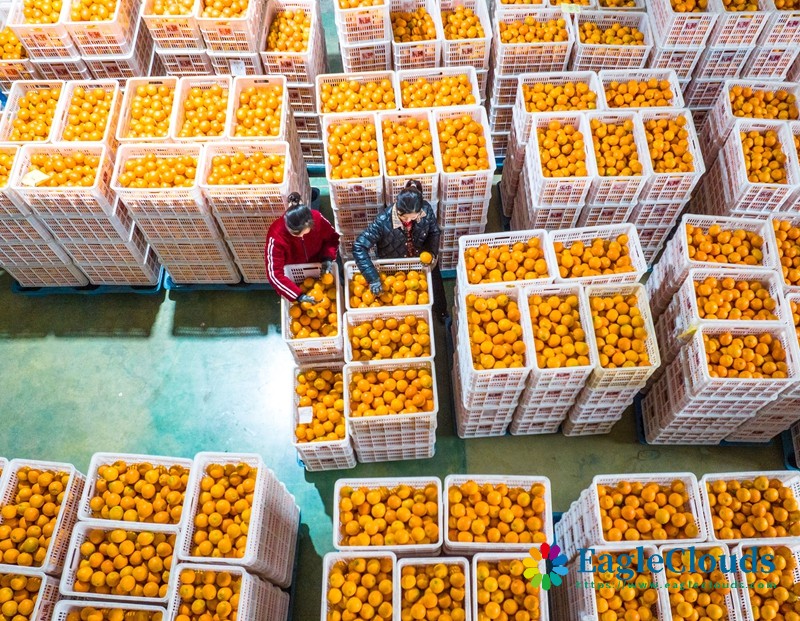 12月12日,工人在湖北省秭归县辰颐物语华中秭归电商物流产业园鲜橙包装车间忙碌(无人机照片)。