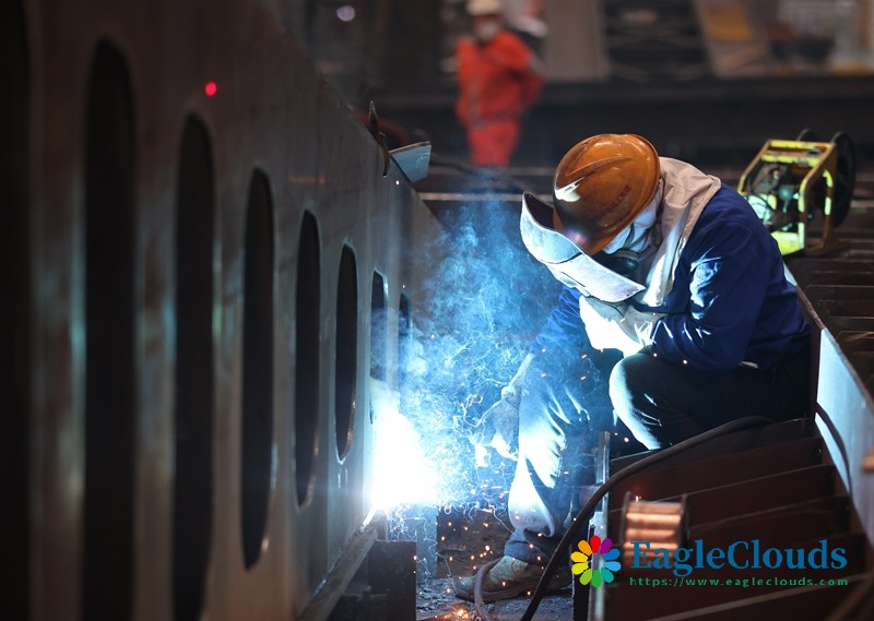 12月12日,湖北省中铁科工轨道公司技术人员对船厂设备进行电焊作业。