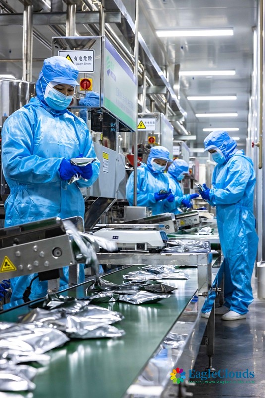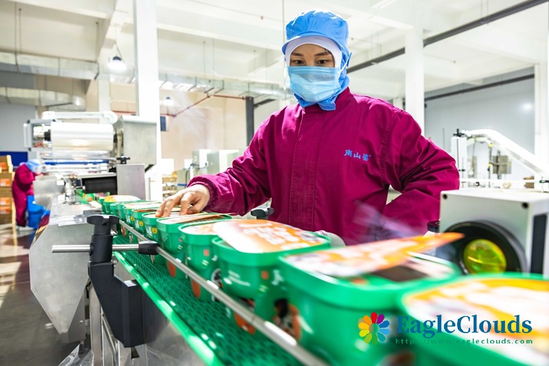 12月12日,工作人员在贵州省安顺市西秀区南山婆食品生态产业园对成品酸汤粉进行包装。