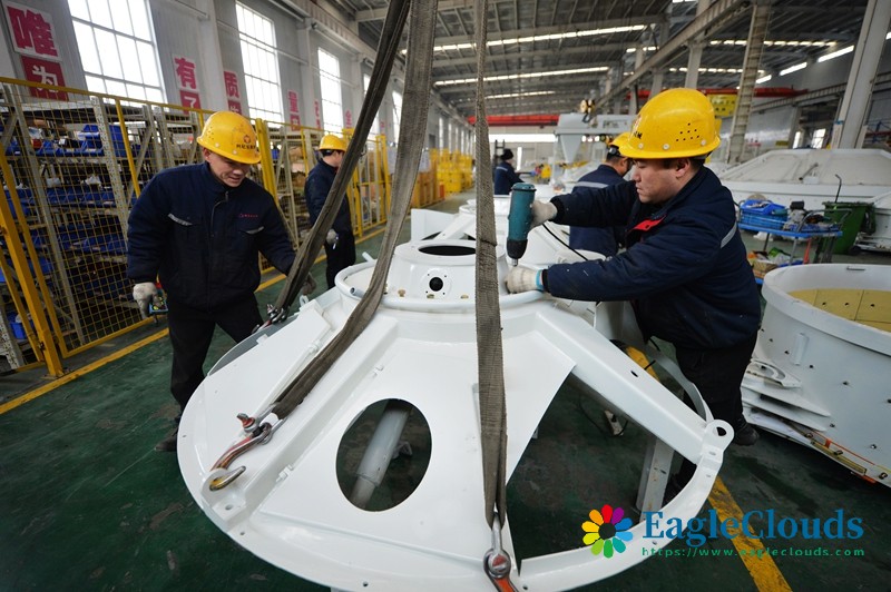 12月12日,在山东省青岛市城阳区夏庄街道青岛中青林集团有限公司生产车间内,工人在吊装混凝土设备部件。