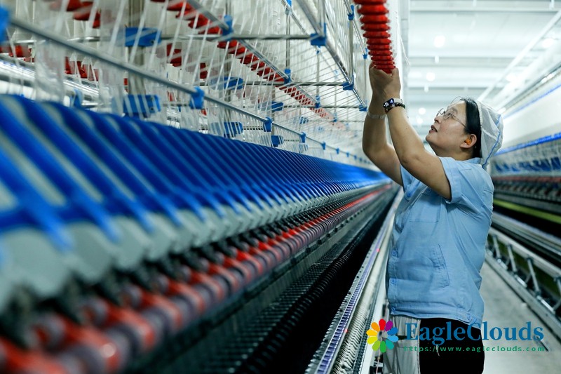 12月12日,青岛即发纺织科技有限公司的工人在智慧纺纱生产线上生产高端纤维。