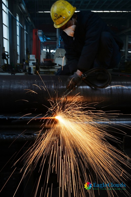 12月12日,在山东省青岛市城阳区夏庄街道青岛中青林集团有限公司生产车间内,工人在切割混凝土设备部件。