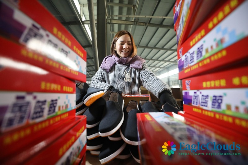 12月12日,河南省焦作市温县张羌街道一家制鞋企业的工人在包装鞋。