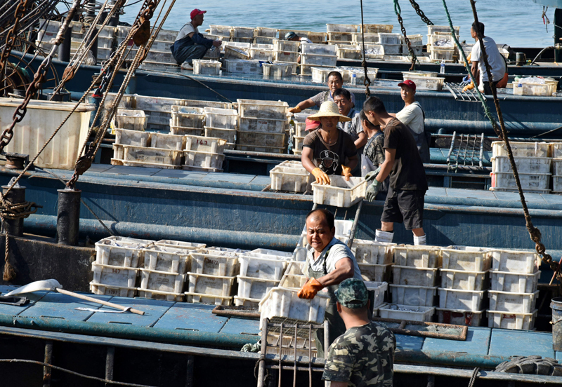 9月7日,在青岛西海岸新区积米崖渔港码头,渔民们忙着卸下渔获。
