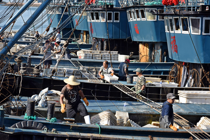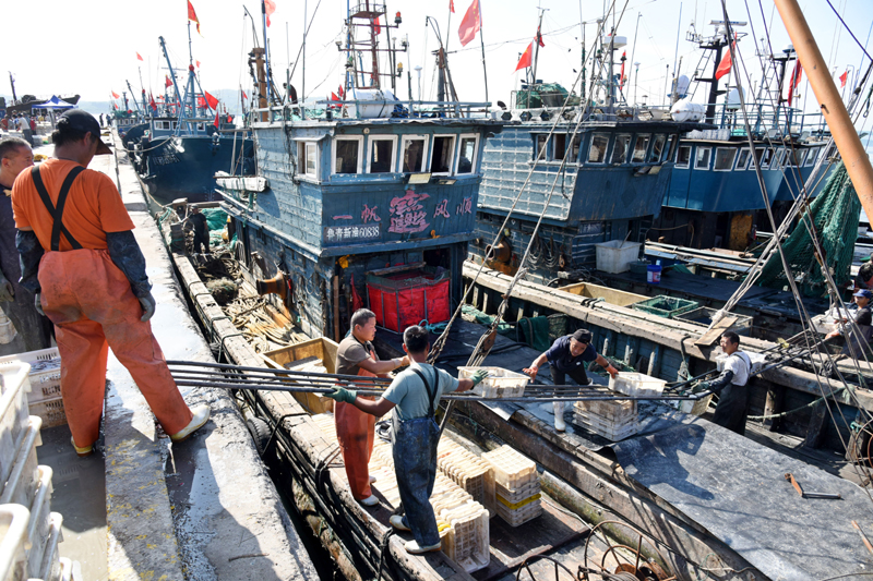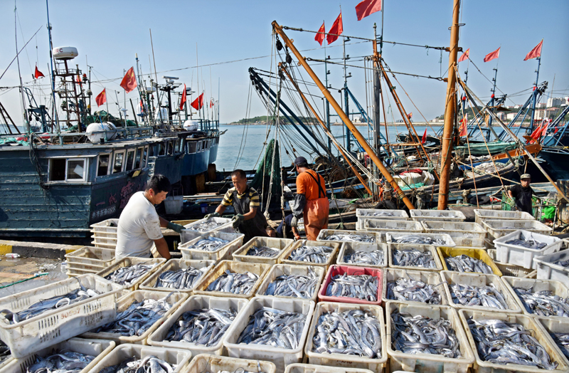 9月7日,在青岛西海岸新区积米崖渔港码头,秋捕归来的渔船纷纷靠港卸货。