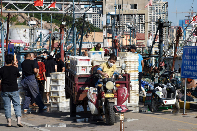 9月7日,在青岛西海岸新区积米崖渔港码头,一位前来进货的鱼贩正在装车。