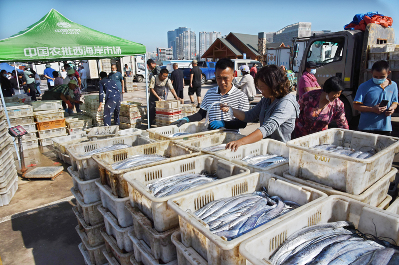 9月7日,在青岛西海岸新区积米崖渔港码头,鱼贩在进货选购。